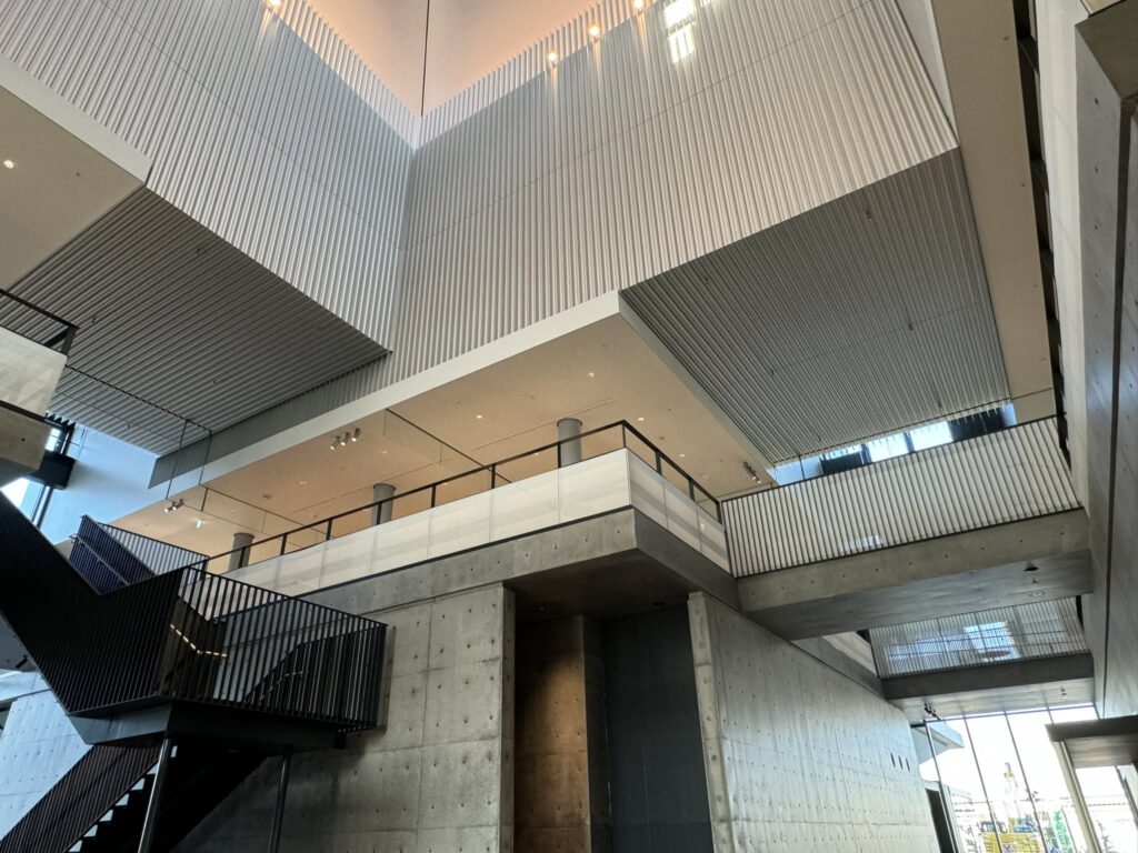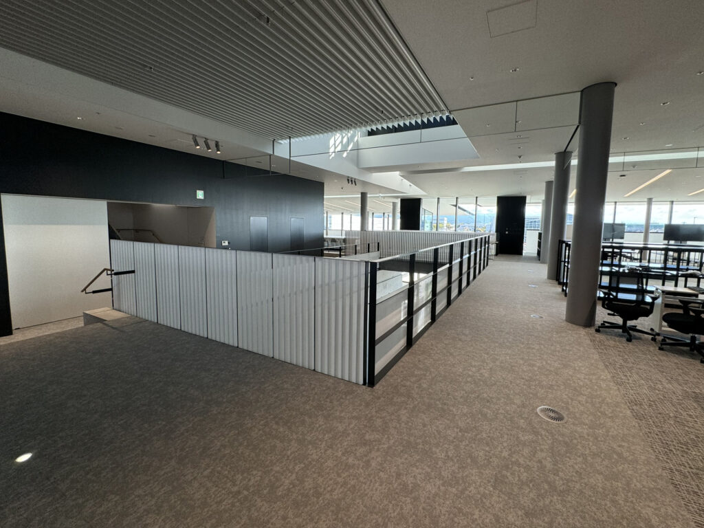 The third floor is designed as a cafeteria and employee lounge, making the most of views of the Tateyama mountain range, Toyama Bay, and Noto Peninsula.